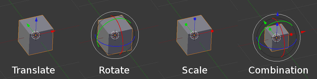 Ctrl-SpacebarThe Transformation manipulator widgets allow mouse controlled translation, rotation and scaling in the 3D View. There is a separate manipulator for each operation. Each manipulator can be used separately or in combination with the others.