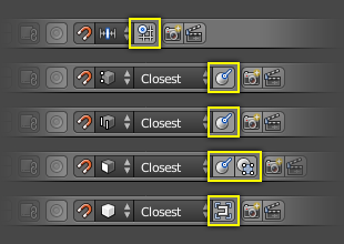 As seen by the yellow highlighted areas in the image above, additional controls are available to alter snap behavior. These options vary between mode (Object and Edit) as well as Snap Element. The four options available are: