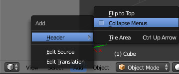 Most headers exhibit a set of menus, located immediately next to the first Editor Type selector. Header menus are used to configure the editor and access tools. All Menu entries show the relevant shortcut keys, if any.
