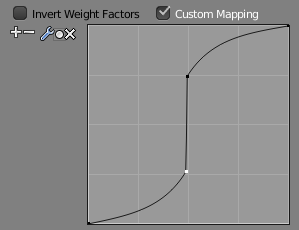 By default, it is an one-to-one linear mapping – in other words, it does nothing! Change it to something like in Fig. Custom mapping curve., which maps (0.0, 0.5) to (0.0, 0.25) and (0.5, 1.0) to (0.75, 1.0), thus producing nearly only weights below 0.25, and above 0.75: this creates great “walls” in the waves...
