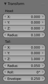 Finally, you can edit in the Transform panel in the Properties region the positions and radius of both joints of the active selected bone, as well as its roll rotation.